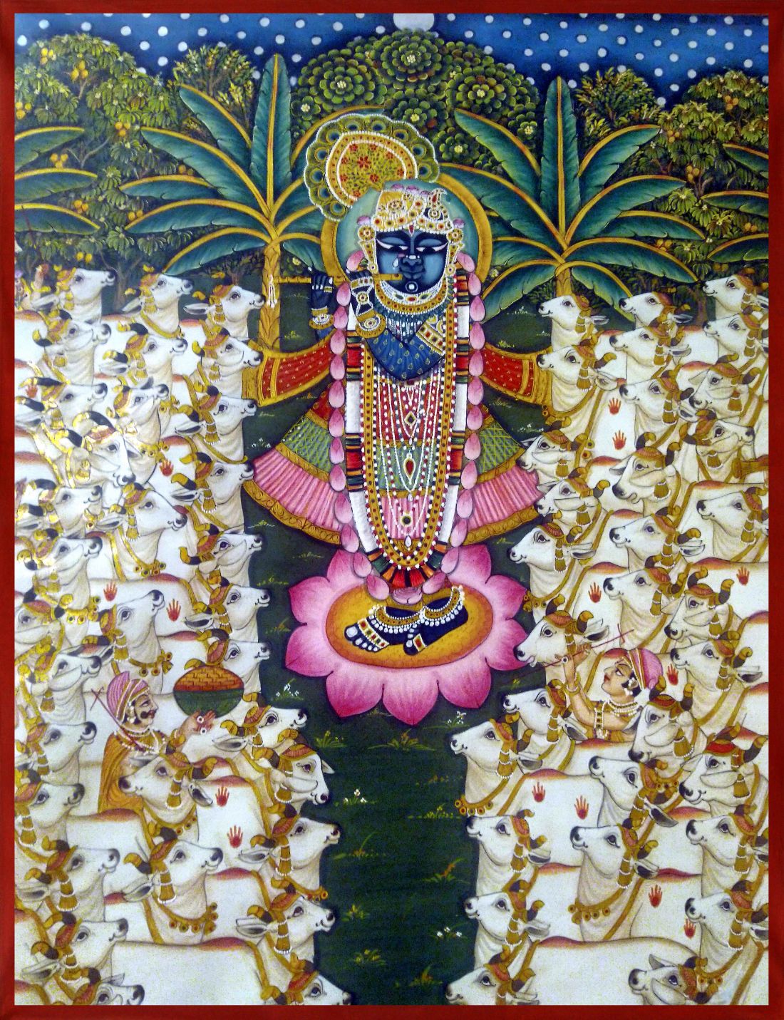 Pichwai paintings depict tales from Lord Krishna's life. He is often depicted as Shrinathji, the deity manifested as a seven-year-old child. Other common subjects in Pichvvai paintings are Radha, gopis, cows and lotuses. Festivals and celebrations such as Sharad Purnima, Raas Leela, Annakoot or Govardhan Puja, Janmashtami, Gopashtami, Diwali and Holi are frequently depicted in Pichwais. Pichwai (Pichvai) style of painting originated over 400 years ago, in the town of Nathdwara in Rajasthan, India. Originally, Pichwai ('pichh' meaning back and 'wai' meaning textile hanging) paintings are hung behind the deity to celebrate different seasons, festivals and events in Lord Krishna's life.