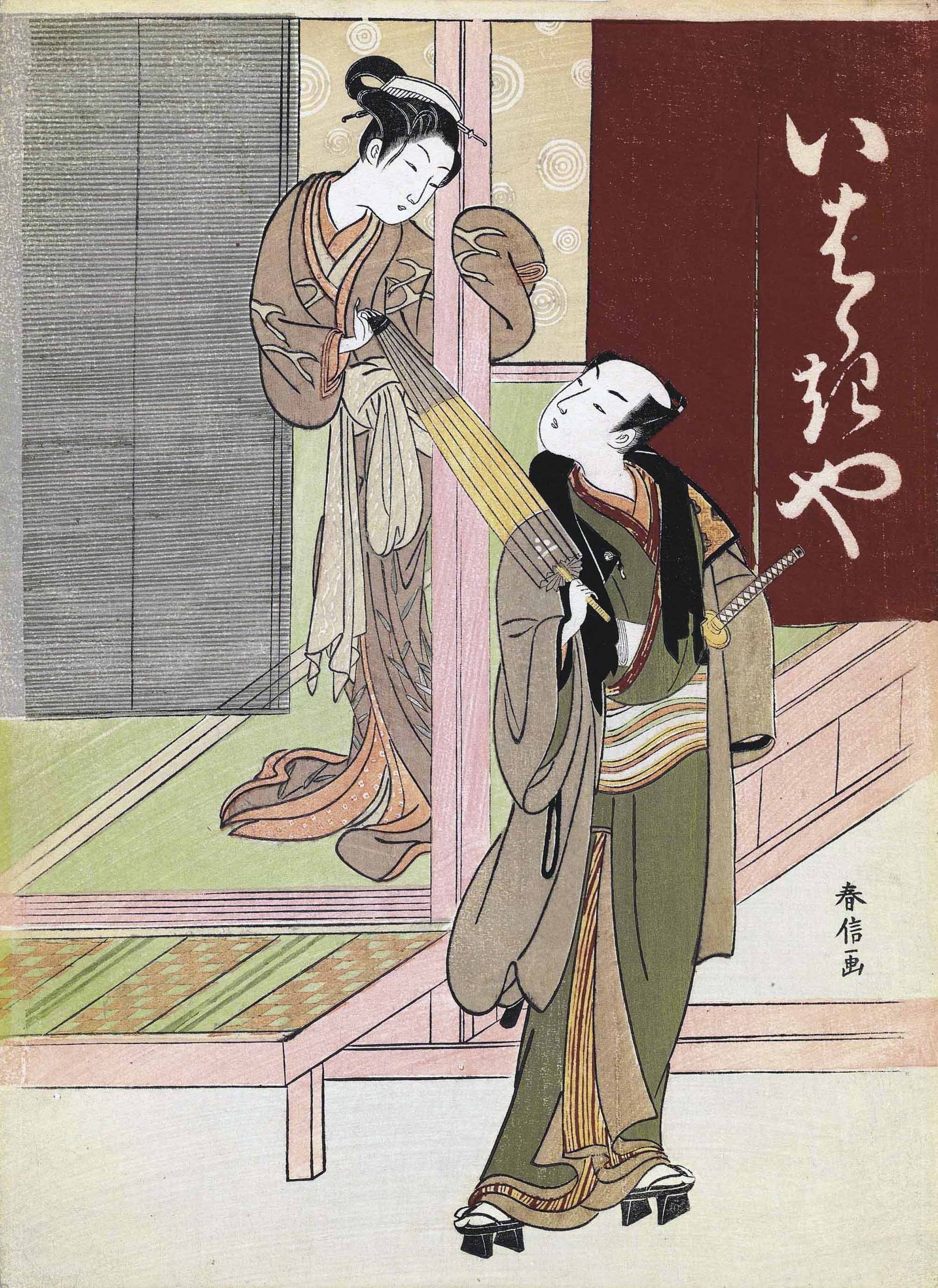A courtesan stands on the verandah of an establishment identified as the Ibaraki-ya on the noren (split curtain) to her left. She engages a young man by holding the tip of his umbrella suggestively, her other hand is hidden within the sleeve of her kimono which she wraps around the pillar of the porch. He pauses, his body in a forward motion but he turns his head back towards the beauty. The wisp of hair that has come lose from her comb suggest that she is attempting to detain a customer with whom she has already exchanged relations. The name of the house, Ibaraki-ya, is clear reference to the legend of warrior Watanabe no Tsuna (953-1025) and his encounter with the demoness Ibaraki who was menacing innocents at the Rashomon gateway located at the southern entrance to the city of Kyoto. In the story, Watanabe no Tsuna confronts the demoness on a rainy night, but only manages to cut off her arm which he saves as a prize, locking it away in a chest. Later, Ibaraki disguises herself as his own aunt and manages to talk her way into his home in order to reclaim her arm.