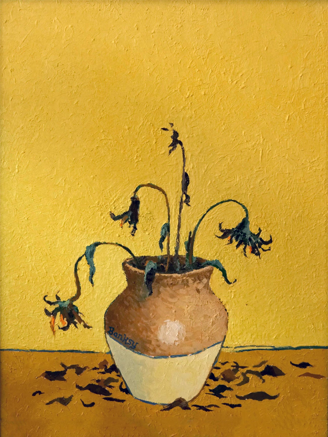 A Banksy painting inspired by Vincent Van Gogh's Sunflowers. Sunflowers from Petrol Station is an icon within Banksy’s oeuvre. Witty, irreverent and subversive, it offers a wry reimagining of Vincent Van Gogh’s celebrated Sunflowers, transforming the Dutch master’s radiant yellow blooms into a cluster of dried, wilted stems. Against a backdrop of thickly-wrought impasto, dead petals accumulate around the base of the vase, which bears the artist’s name in place of Van Gogh’s in blue lettering. A rare and exquisitely rendered example of Banksy’s coveted hand-painted oils, the work formed part of the artist’s seminal 2005 exhibition Crude Oils.