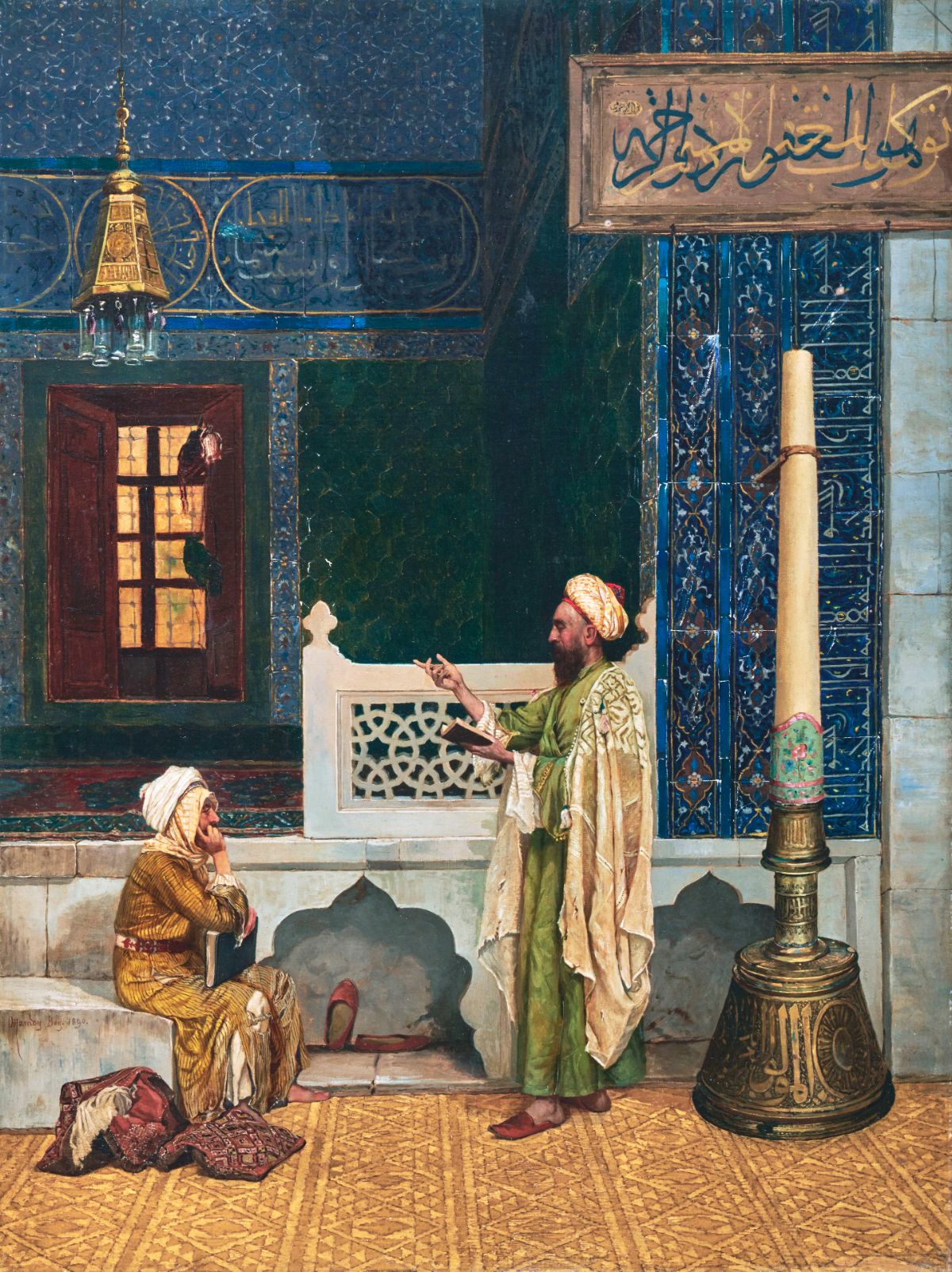 Koranic Instruction Orientalist Painting by Osman Hamdi Bey. Osman Hamdi Bey was an Ottoman administrator, intellectual, art expert and also a prominent and pioneering painter. He was also an accomplished archaeologist, and is regarded as the pioneer of the museum curator's profession in Turkey. He was the founder of Istanbul Archaeology Museums and of Istanbul Academy of Fine Arts (Sanayi-i Nefise Mektebi in Turkish), known today as the Mimar Sinan University of Fine Arts. During his nine-year stay in Paris, the international capital of fine arts at the time, he showed a keen interest for the artistic events of his day. Osman Hamdi Bey also met his first wife Marie, a French woman, in Paris when he was a student. After receiving his father's blessings, she accompanied him to Istanbul (Constantinople) when he returned in 1869, where the two got married and had two daughters.